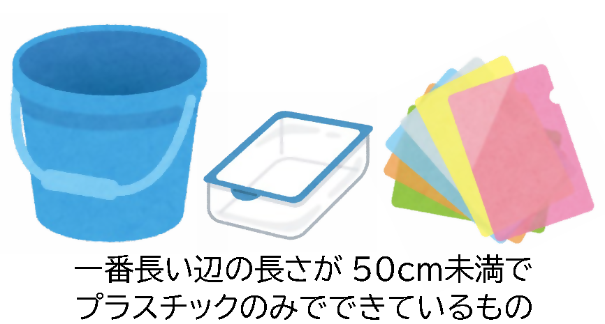 - 一番長い辺の長さが50センチメートル未満の、プラスチックのみで出来ているもの(プラスチックバケツ、タッパー、クリアファイルなど)