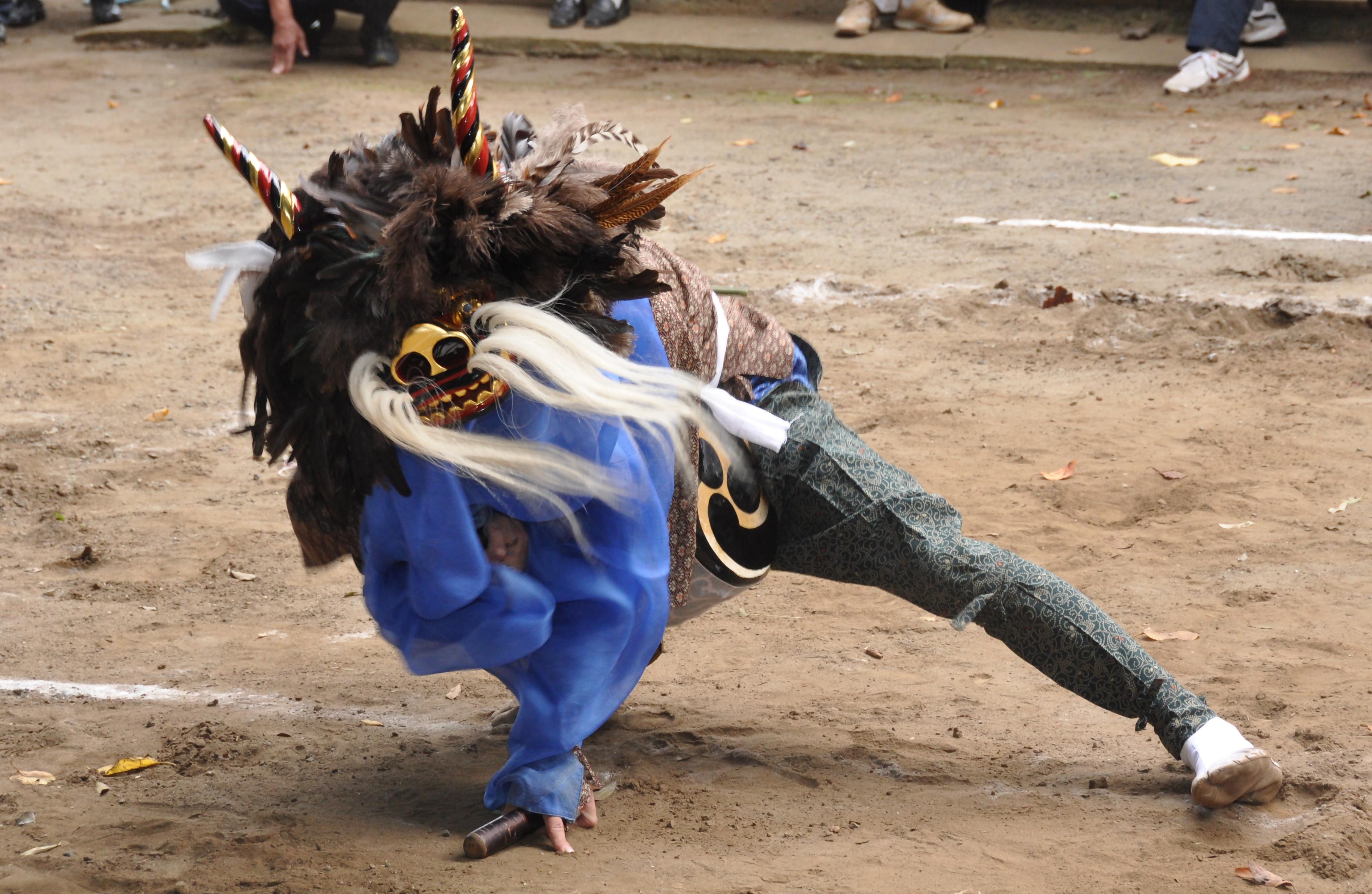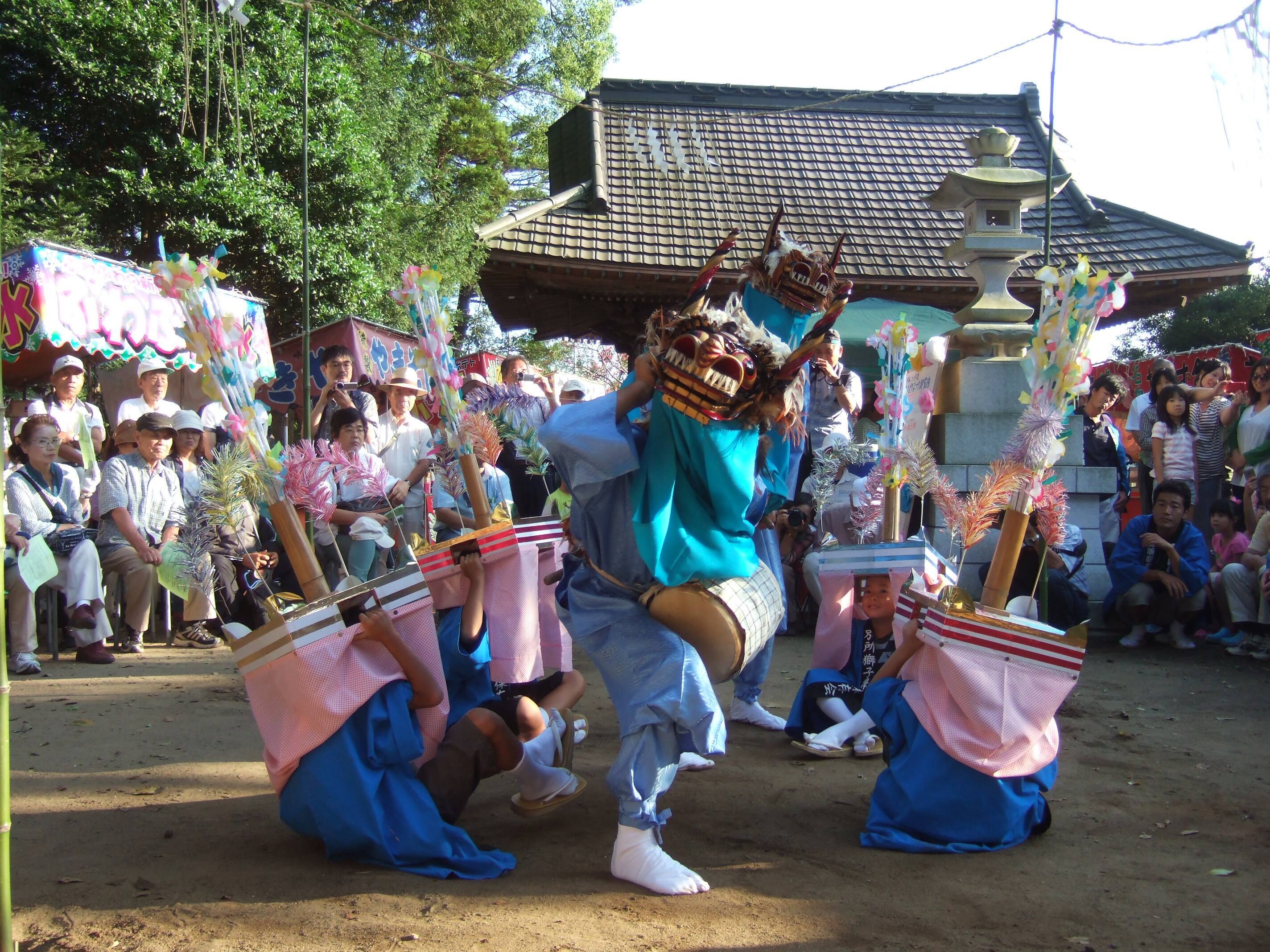 約800年前、獅子頭をかぶり、囃しをつけて村内を巡り歩き悪疫退散を祈願していたものが、次第に猿楽や能楽などの要素が取り入れられ、江戸時代初期から現在の形態になったとされています。笛師の囃しにのり、3匹の獅子(雄獅子・中獅子・女獅子)が舞います。市の無形民俗文化財に指定されています。