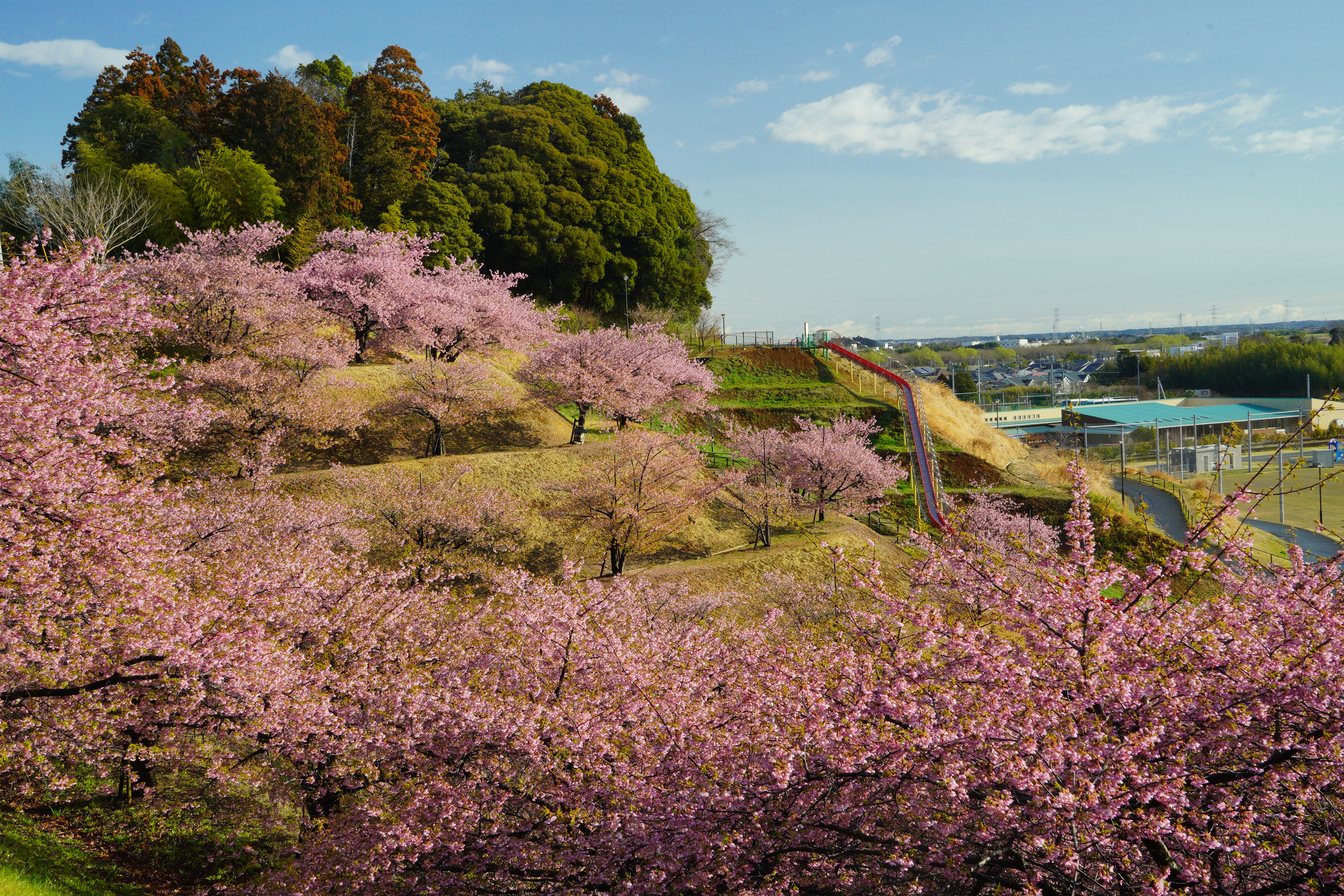 毎年2~3月頃に河津桜が開花します。段々に河津桜の木が植えてあり、満開時には斜面いっぱいを桜の花が覆い、とても見ごたえのある景色が広がります。小林牧場のソメイヨシノよりも半月から1ヶ月ほど早く開花が始まります。