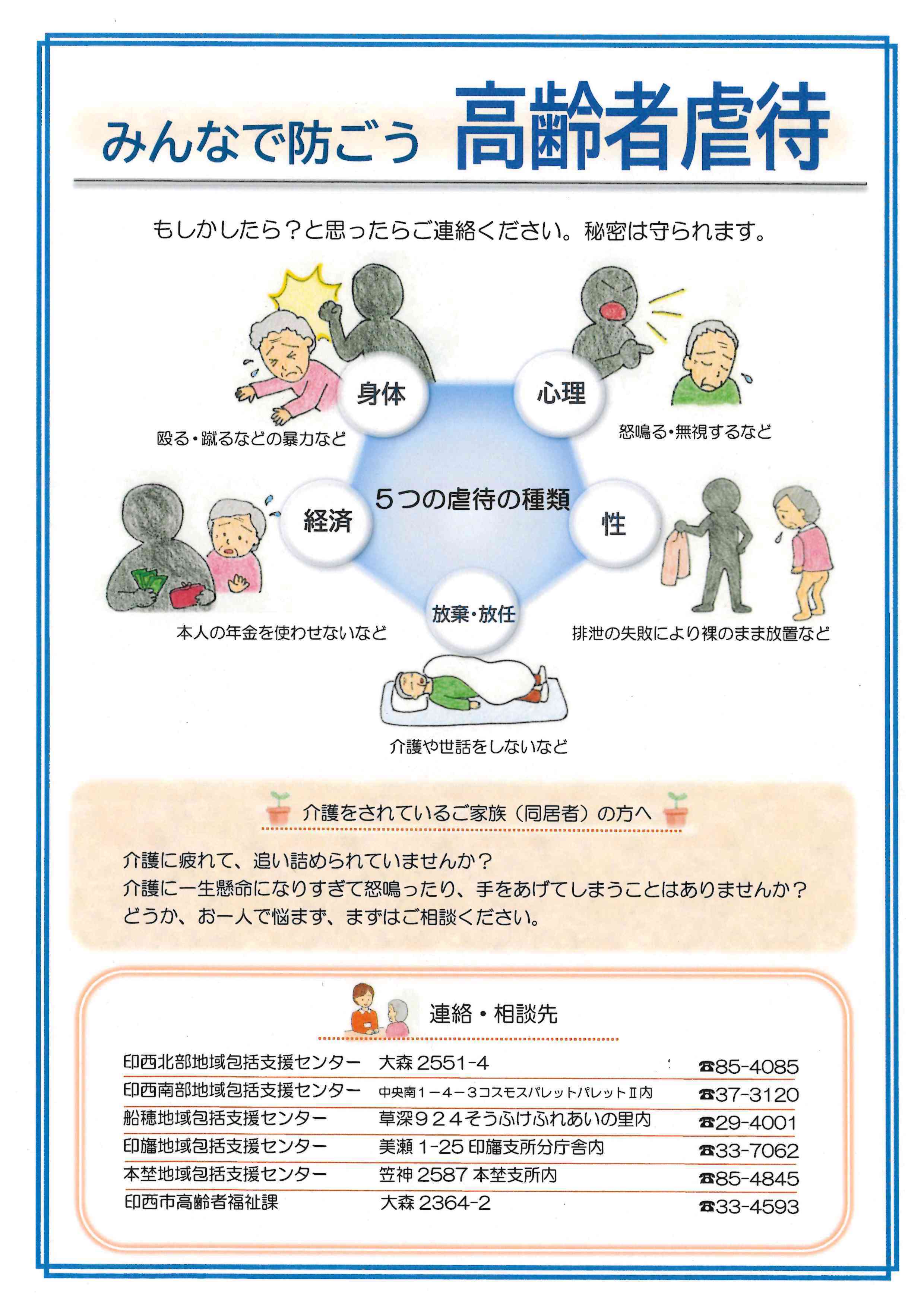 虐待の相談がある場合は、地域包括支援センターまたは印西市役所高齢者福祉課(印西市高齢者虐待防止ネットワーク連絡協議会事務局)までご連絡ください。