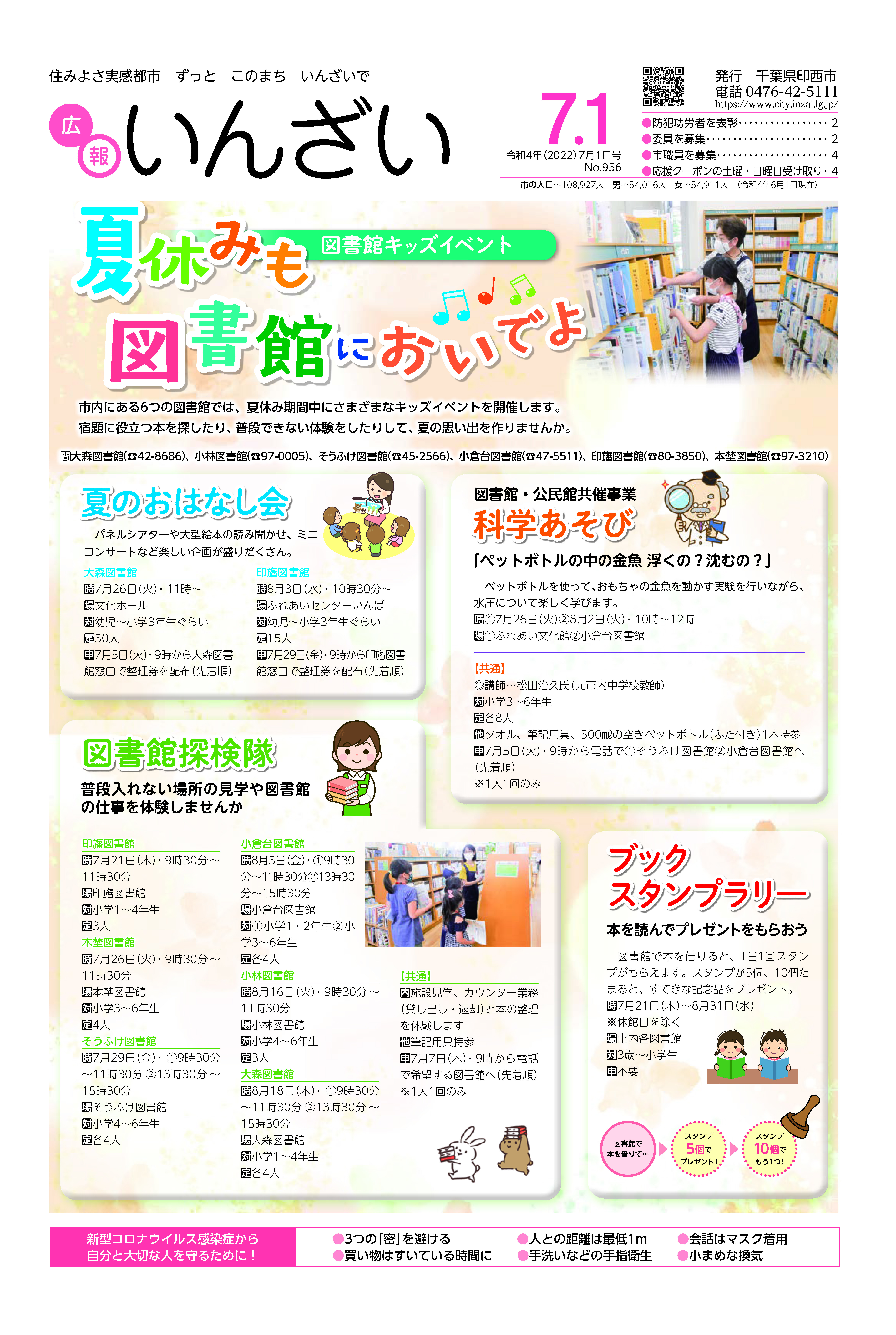 - 4~5面 お知らせ(スポーツ、募集、農業、国保・年金、環境、相談)/夏季休業中の学校プール開放/市職員を募集/消防職員採用試験/みんなの暮らし応援!!いんざい応援クーポン(第2弾)