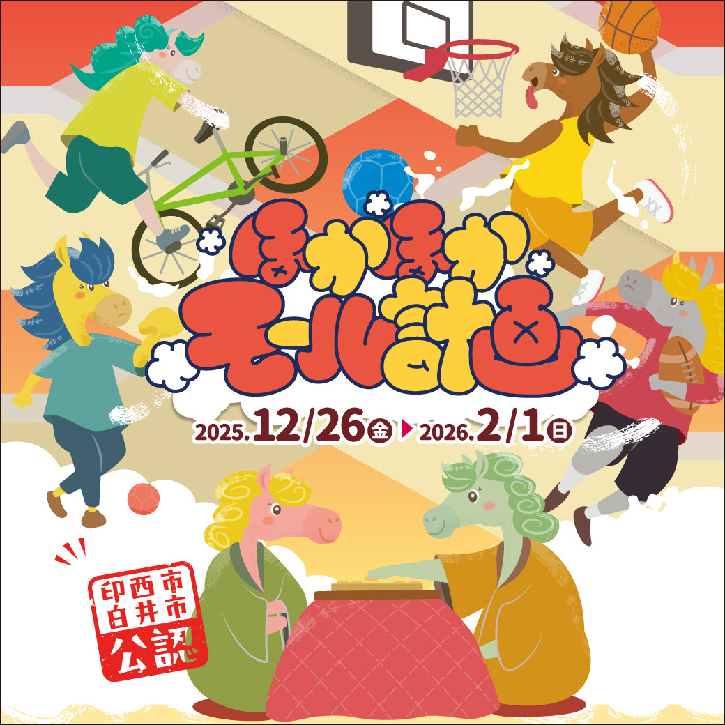 ◎イオンモール千葉ニュータウンでは令和7年12月26日~令和8年2月1日まで、印西市と白井市の公認により、ウォームシェアの取組み「イオンモール千葉ニュータウン ほかほかモール計画」を開催します。同イベントの開催期間中、モール内では、こたつ道が設置され、ボードゲームでご友人やご家族と楽しい時間を過ごすことができます。詳しくはイオンモール千葉ニュータウンのホームページ内でご確認ください。