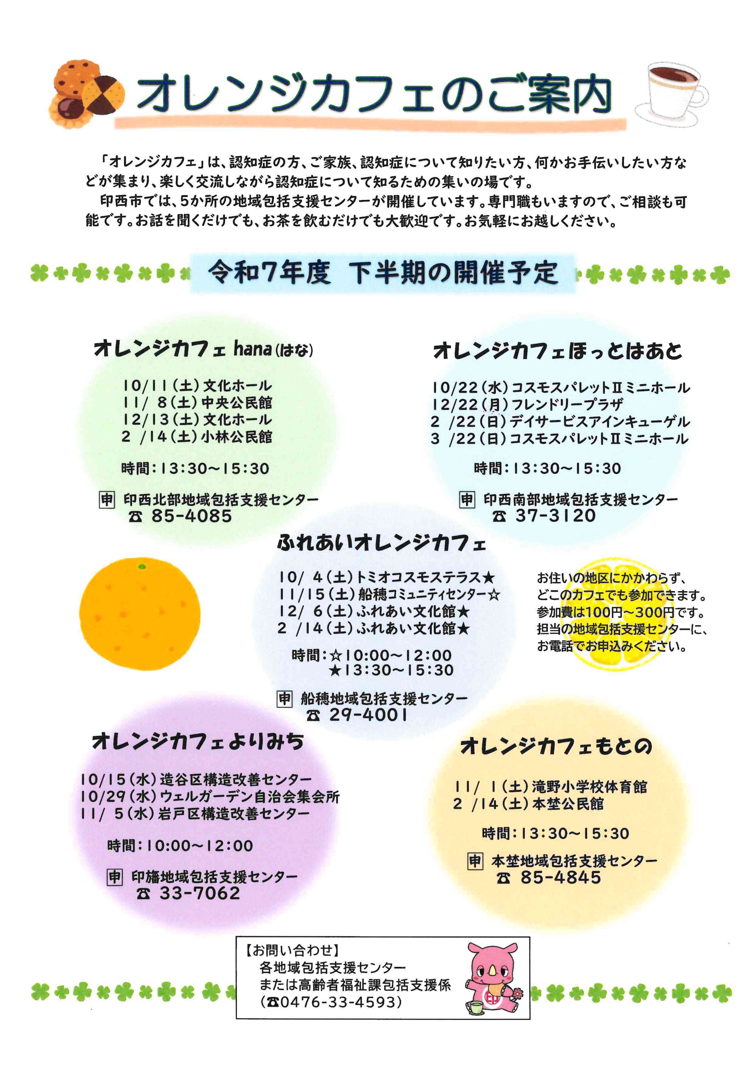 印西市では5か所の地域包括支援センターが開催しています。お住まいの地域にかかわらず、どこのカフェにもご参加いただけます。参加費や詳しい内容は、各地域包括支援センターまでお問い合わせください。