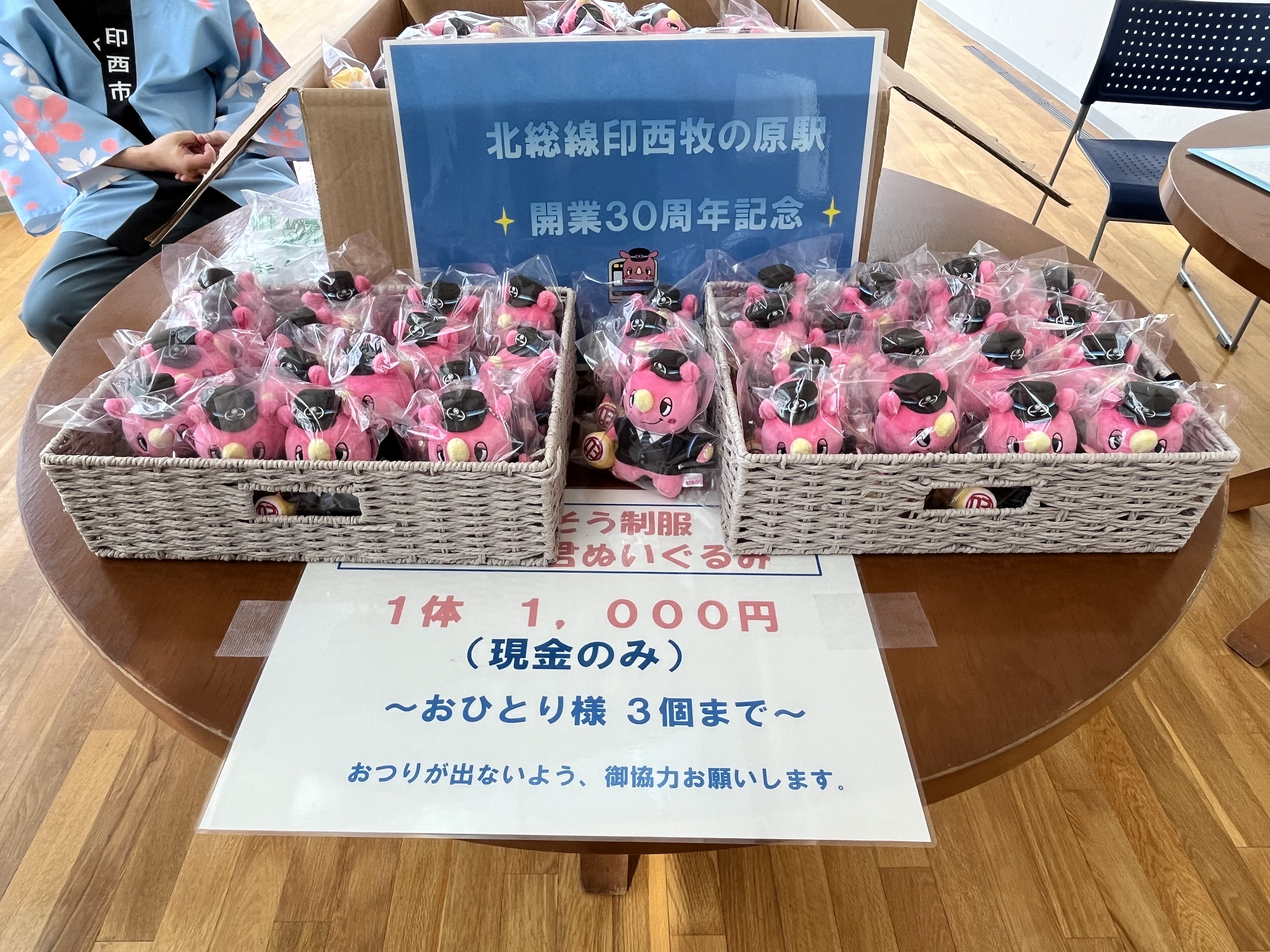 北総線印西牧の原駅開業30周年記念☆いんザイ君が北総鉄道の車掌さんの制服を着たぬいぐるみを、市役所本庁舎で販売します。