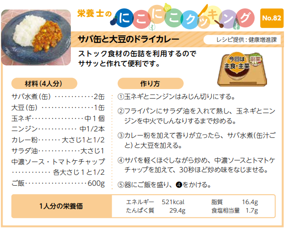 市の栄養士で話し合い、栄養士が在籍する各施設(学校給食センター、保育園、健康増進課)より人気のレシピを家庭で作りやすいようにアレンジし、野菜摂取向上のため季節にあった野菜を使用した「にこにこクッキング」を毎月広報1日号に掲載しています。是非ご活用いただき、まずは今よりも1皿野菜料理を多く食べることから習慣づけていきましょう。