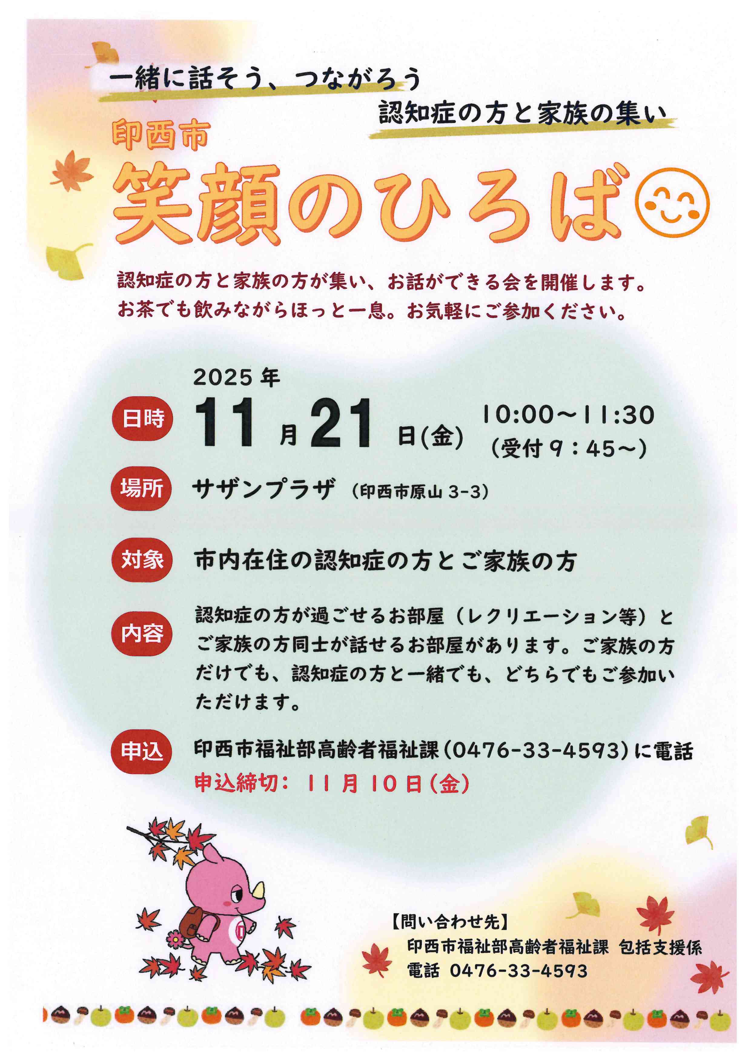 印西市では、認知症の方と家族の方が集い、当事者同士だからこそ分かち合えることや気持ちの共有を図るなどして、交流を深めるため、「笑顔のひろば」を開催します。