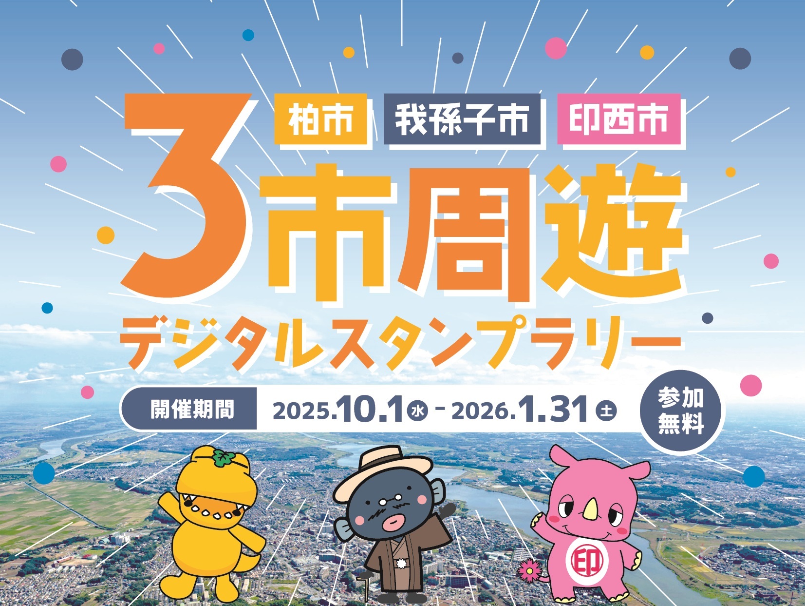 柏市・我孫子市・印西市の各市30か所の合計90か所のチェックポイントをめぐりながら、3市の自然や文化、食などの魅力を体感できる周遊観光スタンプラリーを開催しています。
