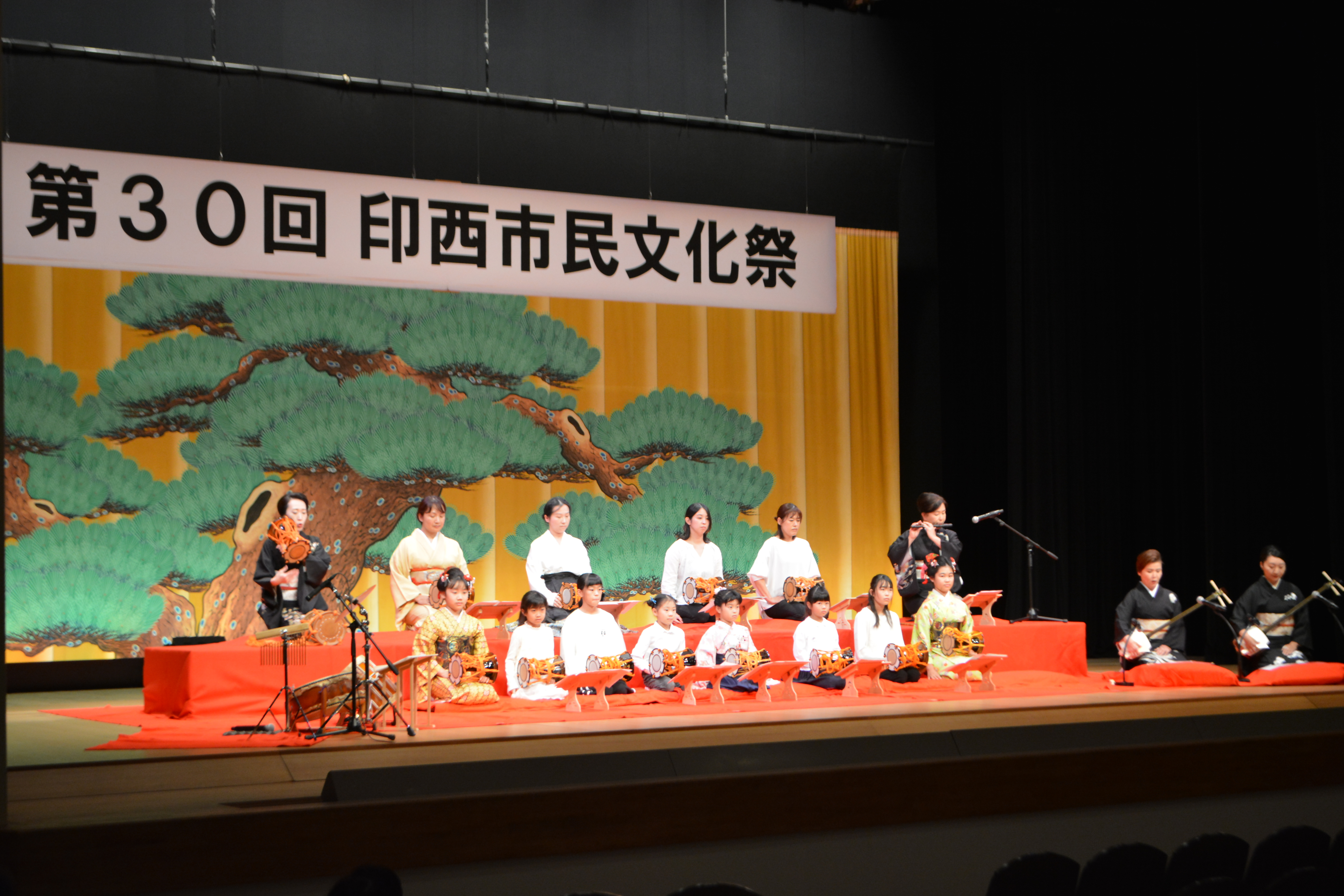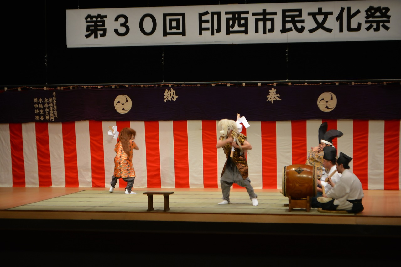 今回は、印西市民文化祭30回目を記念し、オープニングイベントとして文化庁の補助事業である伝統文化親子教室の「印西神楽子ども教室」、「印西邦楽邦舞子ども教室」で学んだ子どもたちが「伝統文化親子教室成果発表」として教室で学んだ成果を発表しました。また、ご指導いただいた先生方の特別講演もしていただきました。
