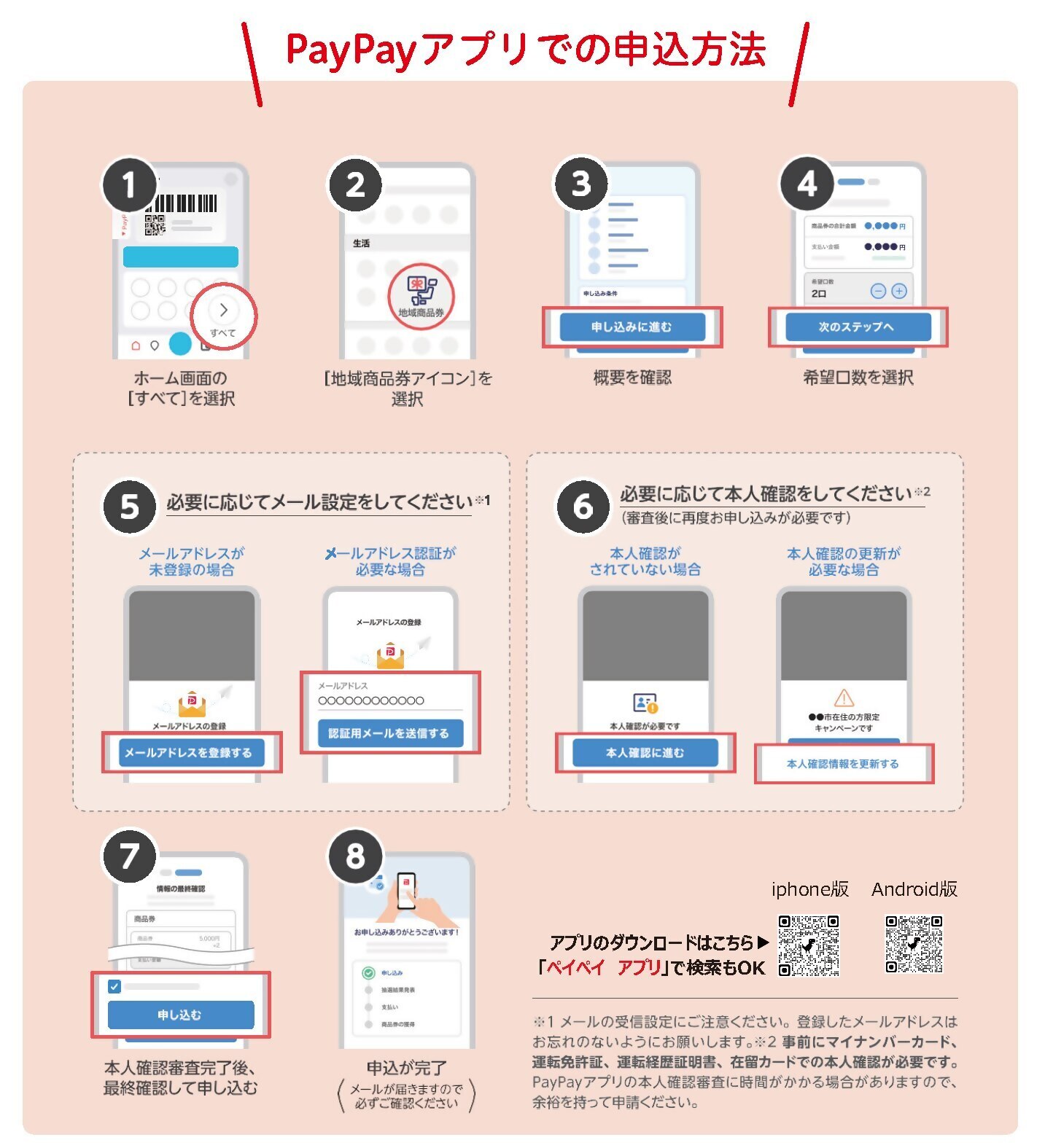ご自身のスマートフォン、PayPayアプリで本人確認をしていない方は、本人確認書類(マイナンバーカード、運転免許書、運転経歴証明書、在留カード、特別永住者証明書のいずれか1点)をお持ちください。