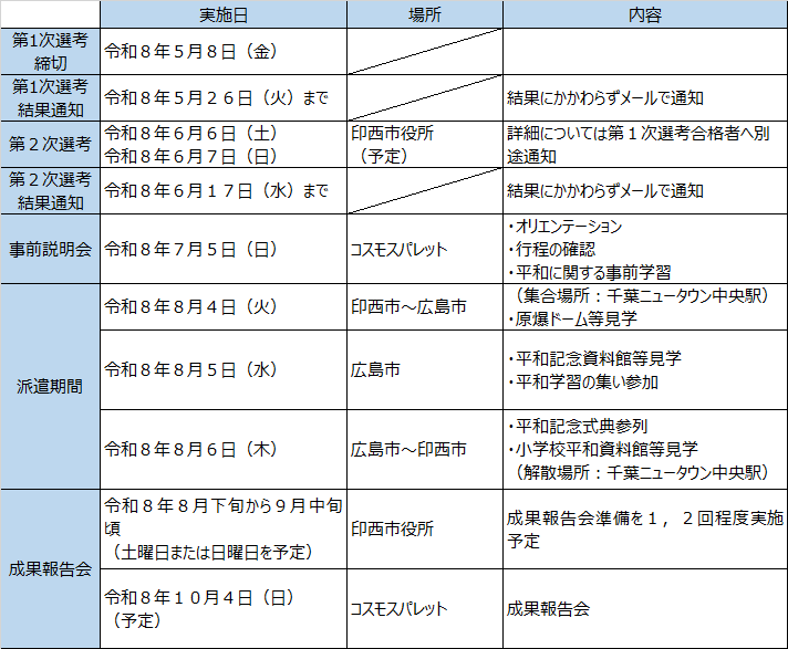 市内在住の中学生を広島市に派遣し、平和記念式典への参列や現地での学習を通じて、原爆の悲惨さと平和の尊さを学んでいただく「令和8年度印西市中学生平和学習派遣事業」を実施します。