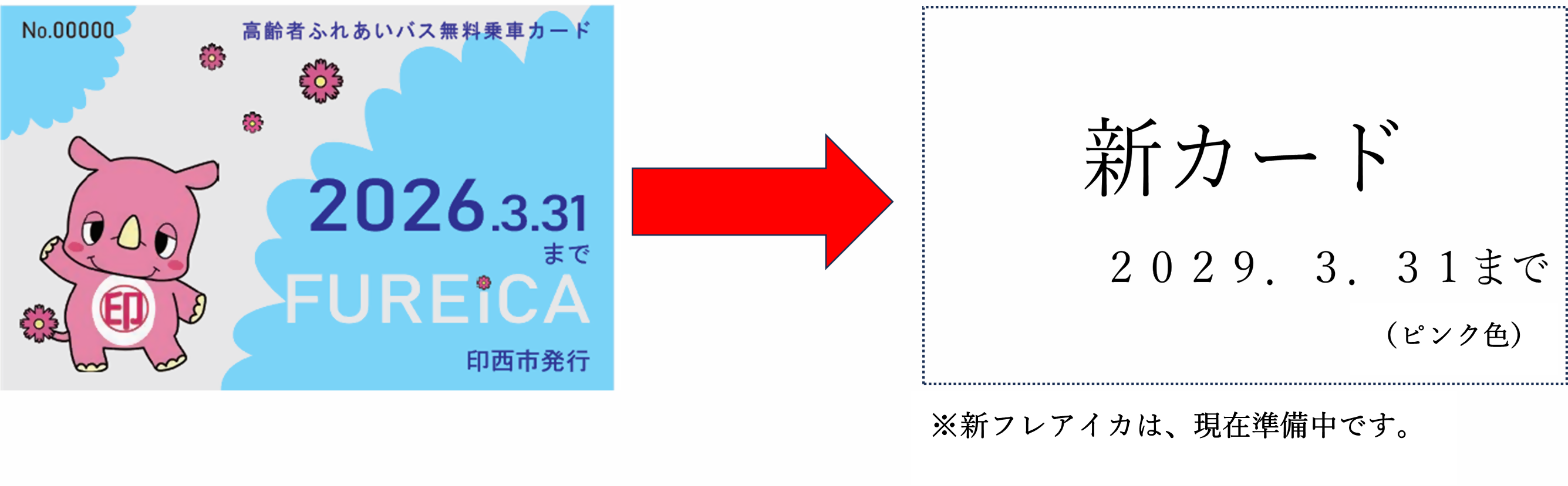 4月1日から使用できる新しいフレアイカ(ピンク色)は、3月下旬頃に御本人あてに郵送いたします(申請不要)。