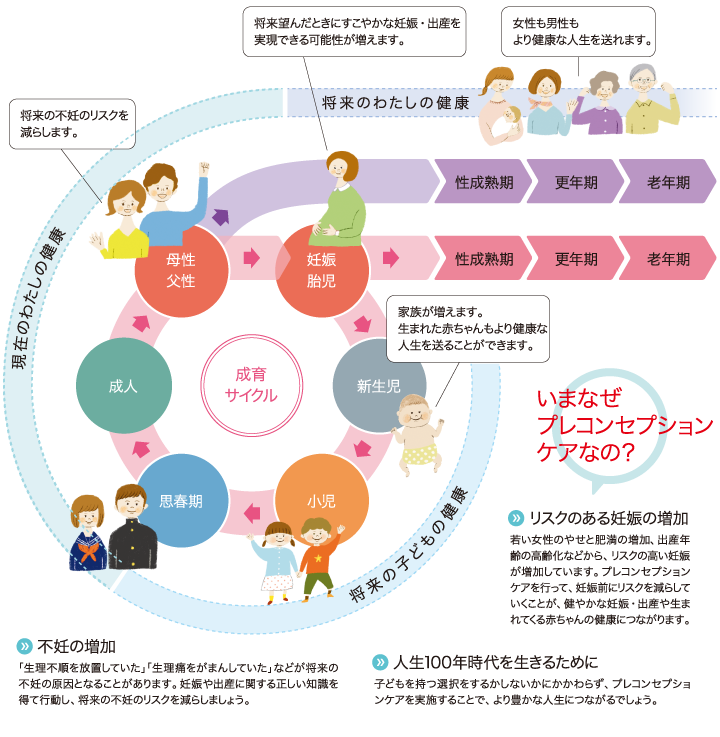 若い方が将来のライフプランを考えて、性別を問わず、適切な時期に性や健康に関する正しい知識を持ち、妊娠・出産を含めたライフデザイン(将来設計)や将来の健康を考えて健康管理を行う取り組みです。