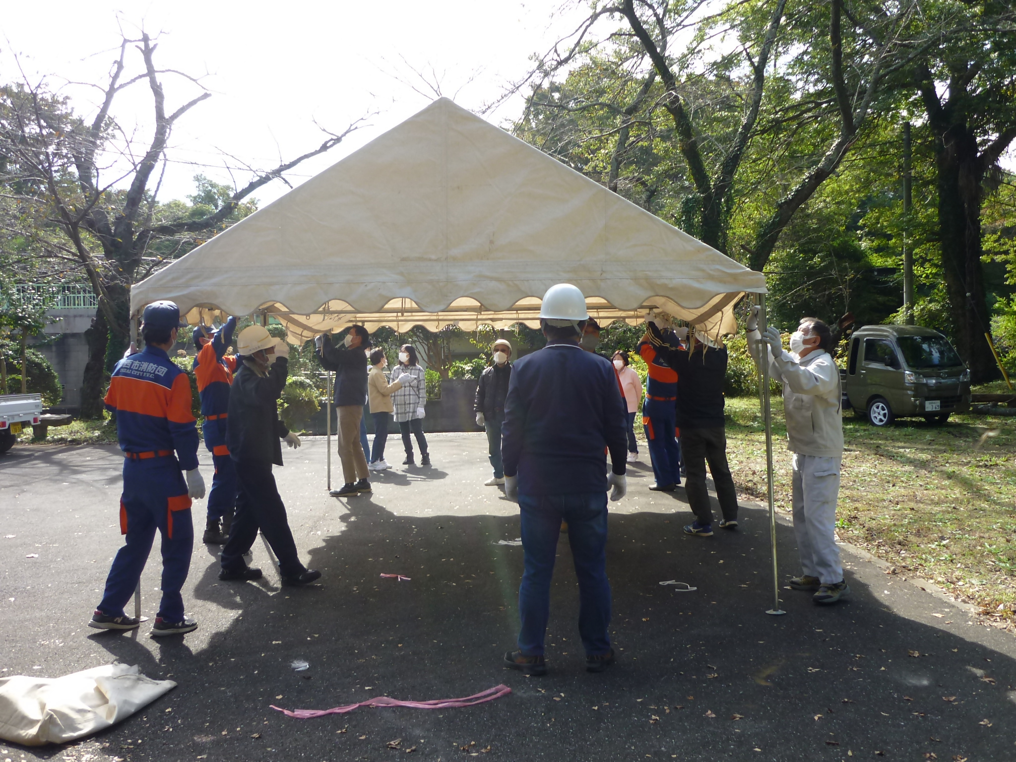 避難所受付訓練に伴うテント設営の様子です。訓練参加者は避難者名簿に必要事項を記入し、受付を行います。
