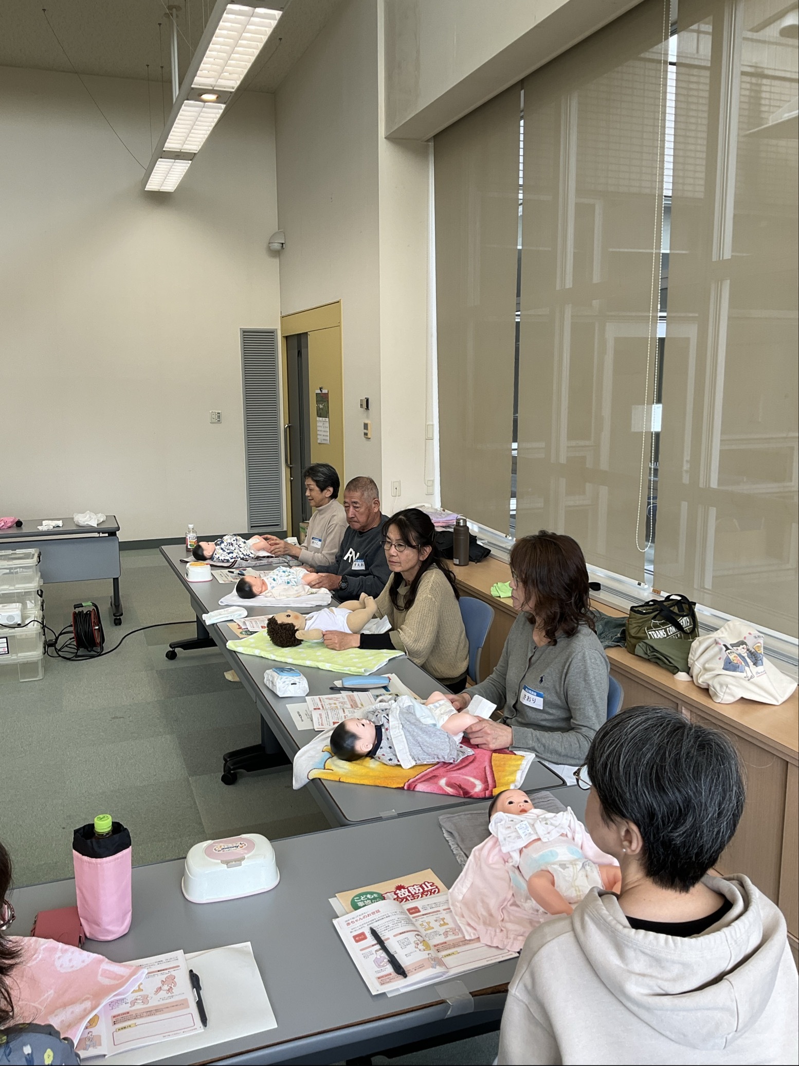 講座は、ファミリーサポートセンター職員の「赤ちゃんのお世話の仕方」と「おむつ交換」の実技と、東京基督教大学の先生による講義の2段階で実施しました。