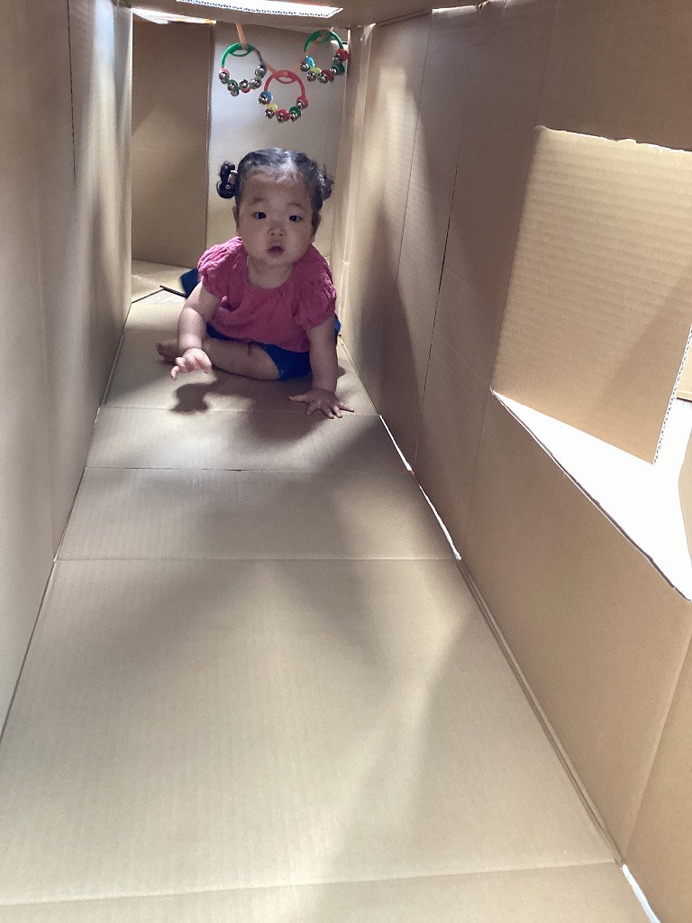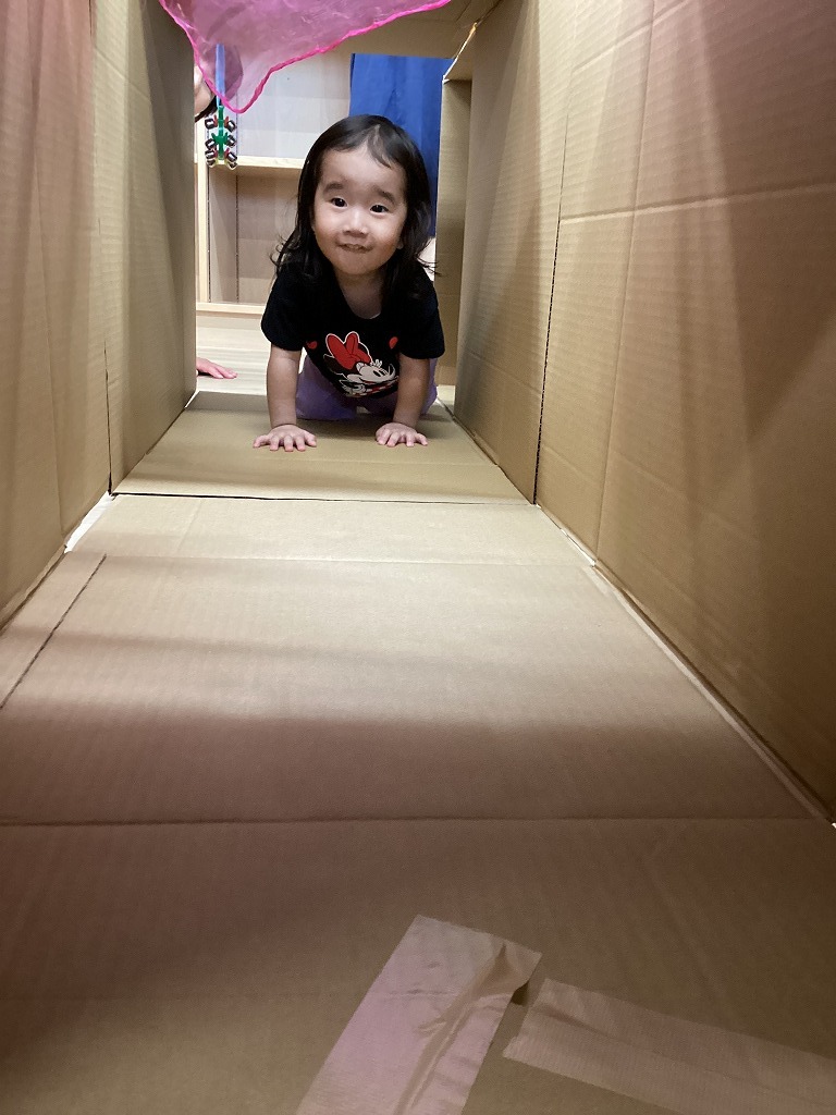 たくさんの段ボールで作ったトンネルの中には鈴やスカーフ、お顔を出せる穴もたくさん!