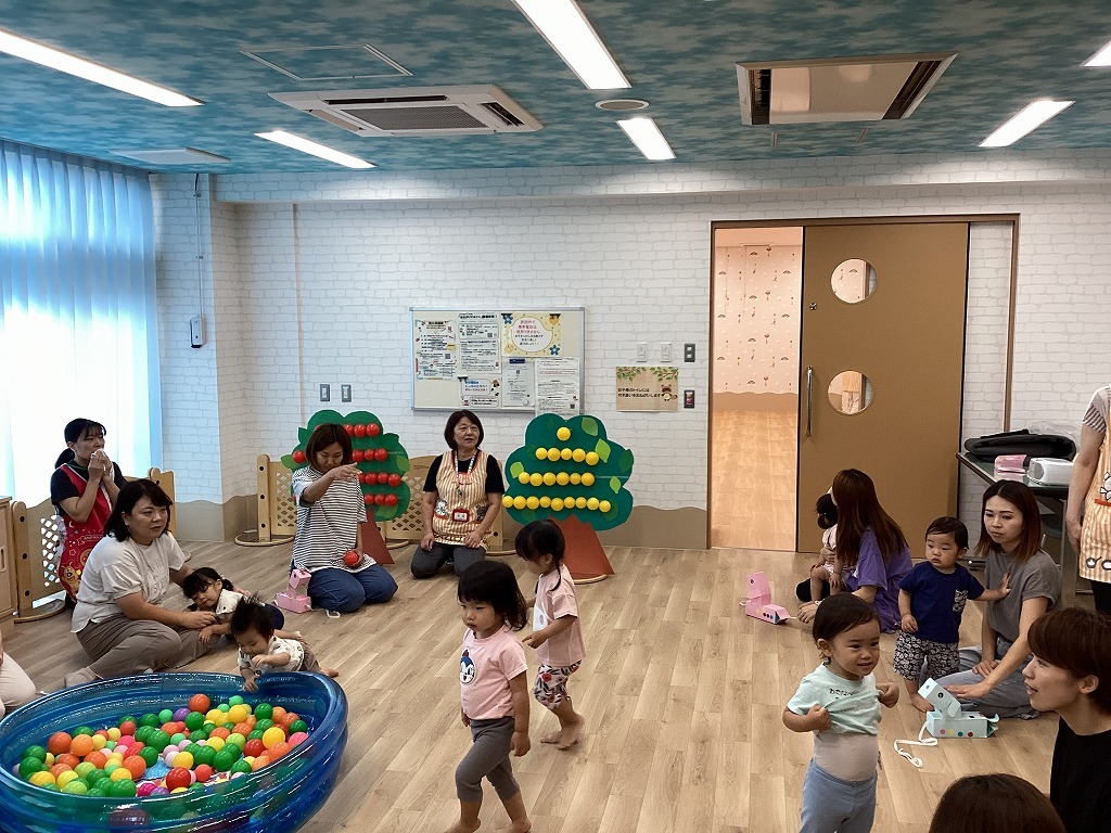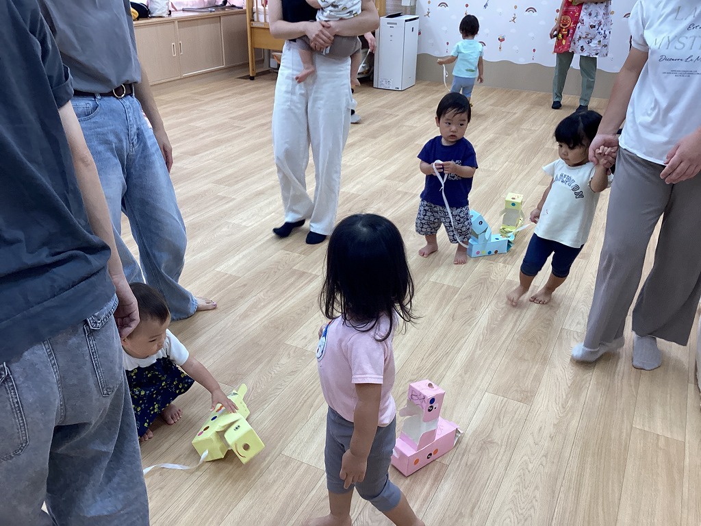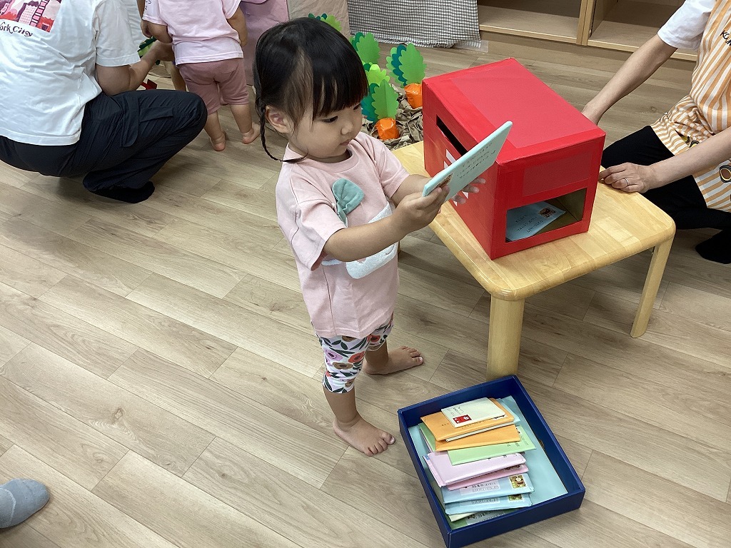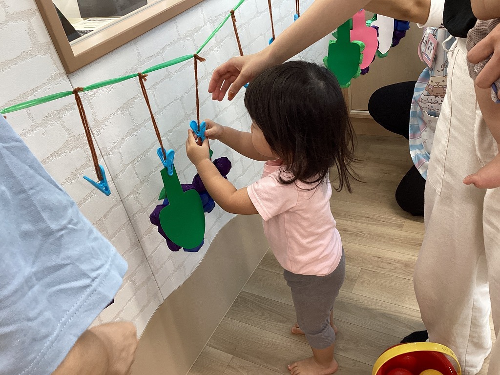 「お返事はーい!」ができたらタンバリンでをたたいてニコニコのお子さんたちでした。お散歩ワンちゃんを作ったら、秋の果物を収穫しに出発進行!盛りだくさんのKidsクラスでした。