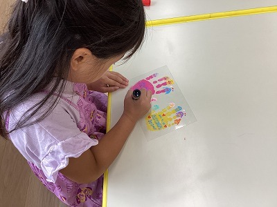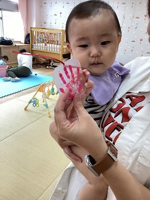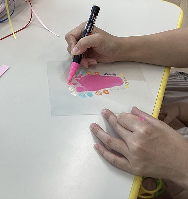 プラバンに可愛い手形や足形を押して絵を描いて・・素敵な作品が完成しました。