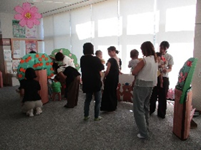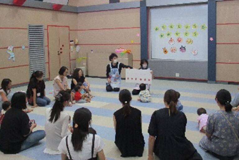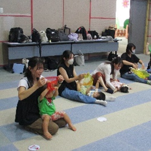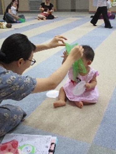 9月のBaby’sタイムは、「親子でふれあい遊びを楽しもう」。柔らかい布を使って、「いないいないばぁ」をしたり、わらべ歌や「おばけのワルツ」の歌で赤ちゃんといっぱい触れ合いました。