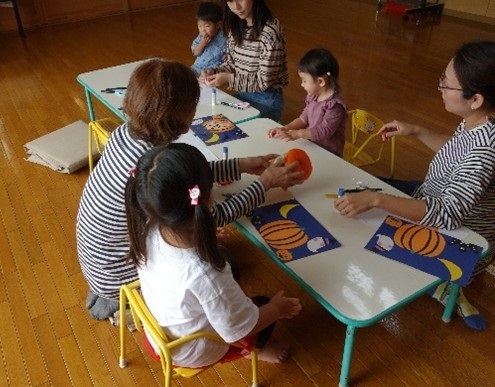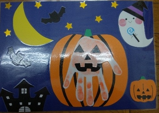 10月7日手形足型アートを行いました。今月はもうすぐハロウィンという事で手形をジャックオランタンに見立てて製作を行いました。コウモリや星のシールを貼ってもらったり、お顔を描いてもらいましたよ。それぞれ個性が溢れる素敵な手形アートが完成しました。4組8名の方にご参加頂きました。ありがとうございました。