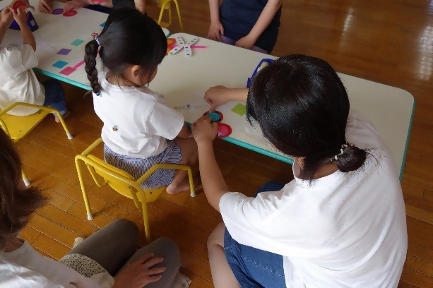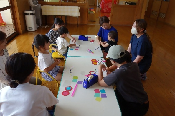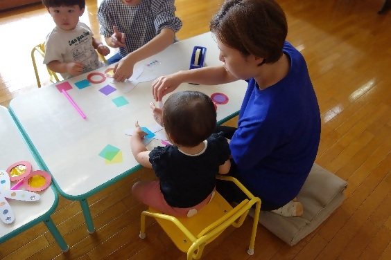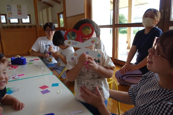 10月8日(水曜日)「製作遊び」を行いました。今月は秋らしくトンボのめがねを製作しました。ママさん達にはお子さんが選んだカラーセロファンをテープで貼ってもらい、お子さんは羽にシールを貼ってカラフルなトンボにしてもらいました。出来上がるとメガネで覗いてみたり、動かしてパタパタ飛ばしてみたりと可愛らしい姿が沢山見られました?4組9名の方にご参加頂きました。ありがとうございました。