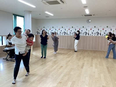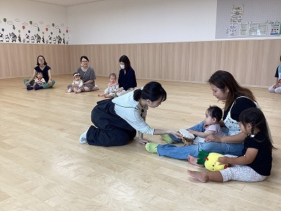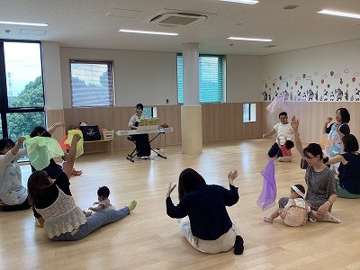言葉のリズムに合わせてタンバリンを叩きながら「お・は・よ・う!」の挨拶。先生の弾く曲に合わせて親子でお散歩したり、カラフルな布を使って、いないいないばぁやお花を作って楽しみました。素敵なピアノ演奏と音楽に合わせてあそぶ、あっという間の1時間でした。