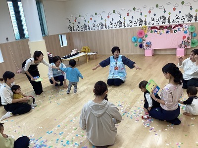 そして、誕生会の最後には、職員からの花紙シャワーのプレゼント・・・床に落ちた花紙を集めて楽しんでいた子ども達でした。