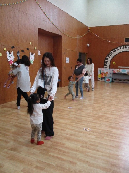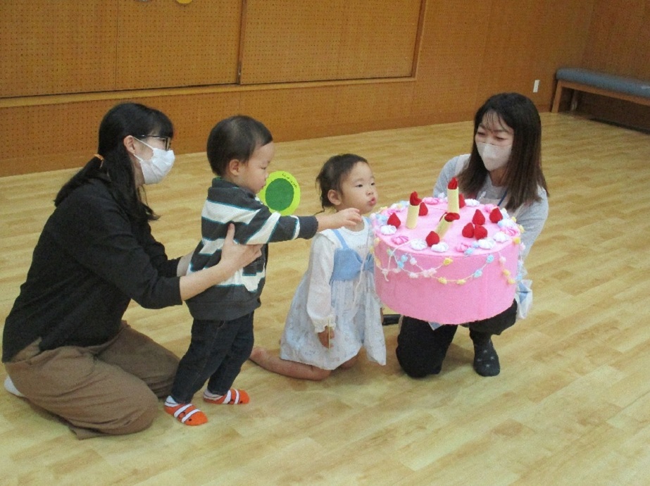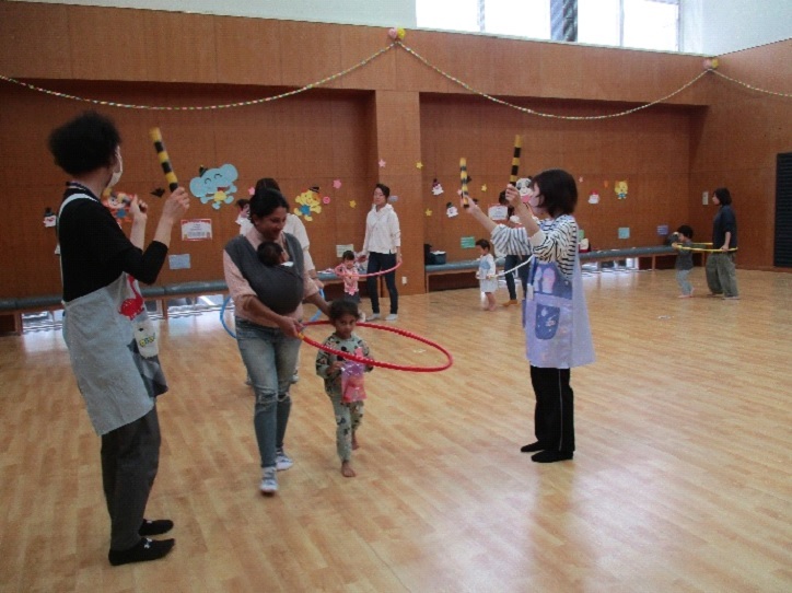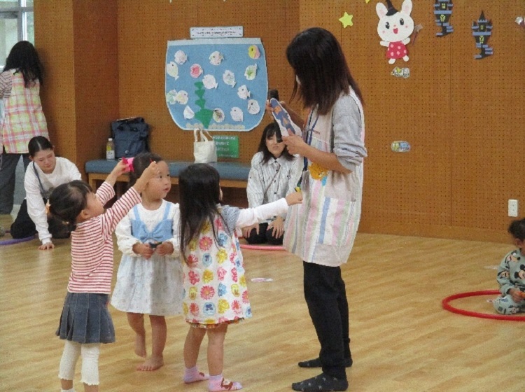 今月のチャイルドタイムは、中庭で宝探しをする予定でしたが、雨が降ってしまい室内で活動を行いました。忍者さんからなくした手裏剣を探しに行ってほしいとお願いされたchildタイムのお友だちは、バスに乗って遊園地に行ったり森に行ったり!森では、オオカミさんと追いかけっこをしましたね。ちょっぴり怖がっていたお友だちも上手にお家の中に逃げることができていました。ルールのある遊びでは、ルールを理解し楽しむことができるようになってきて成長を感じます。来月はミニ運動会を行う予定です。お外で思いきり体を動かし楽しめるといいですね!来月も皆さんのご参加をお待ちしております。