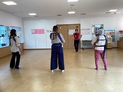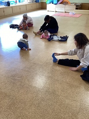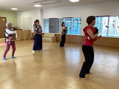 今年度2回目の「ベビーダンス」を行いました。抱っこひもの正しい使い方を教えてもらい、いつもよりお子さんと密着姿勢になり、音楽に合わせてステップを踏んでいると、心地よいリズムにみんなスヤスヤ。親子の良いスキンシップになりました。