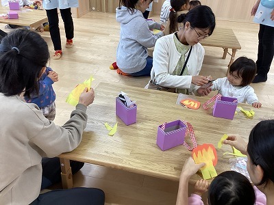 10月の季節のおもちゃ箱で、『かぼちゃとおばけのバック』を作りました。9組18名の参加で賑やかなハロウィンイベントになりました。