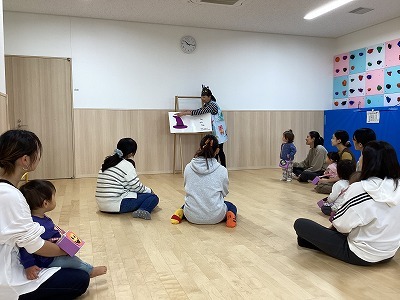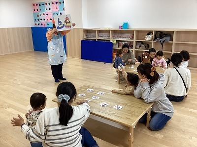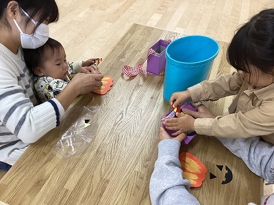 お花紙をビリビリ破ると!!可愛いおばけやカボチャが出てきて素敵なバックができました。大型絵本もみんなで楽しみ、最後はハロウィンのカード探しで盛り上がりました。