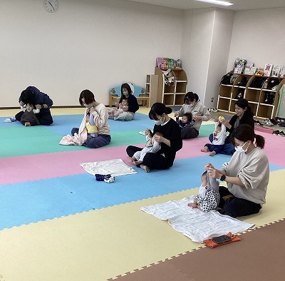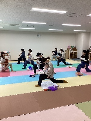 ベビトレヨガ2回講座の2回目でした。定員に空きがあった為、追加募集を行い、7組15名の方にご参加いただきました。親子で一緒に行えるヨガは、お子さんもママもリラックスしながら、心地よい疲れを感じるとともにたくさんの笑顔が見られました。教えていただいた体幹遊びで、お家でも親子で楽しくベビトレヨガを楽しめますように!