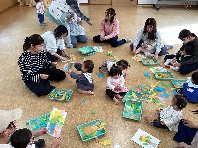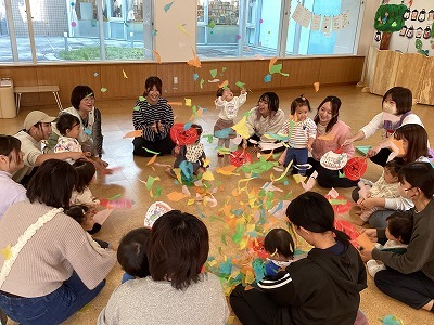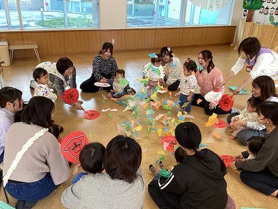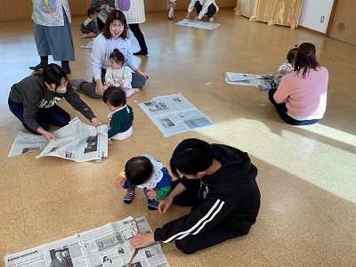 あんよクラス後期第3回の講座に10組20名の親子が参加し「紙遊び」を楽しみました。