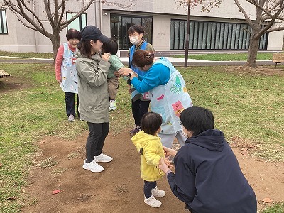 みんなでダンスを踊って、『握手でこんにちは』の曲に合わせてご挨拶、ブルーシートの上で『風車』も作って、季節を感じながら、みんなで楽しく遊びました。