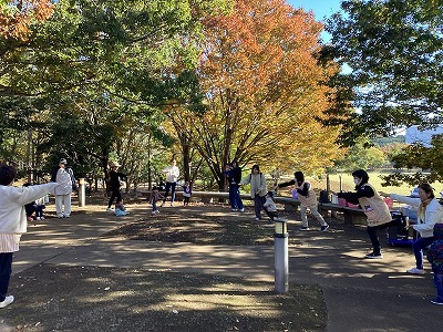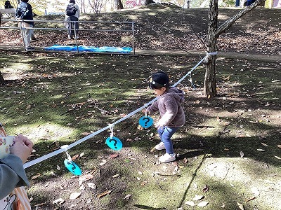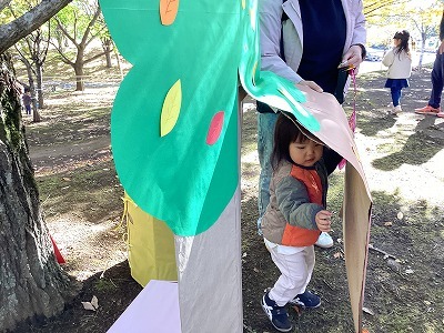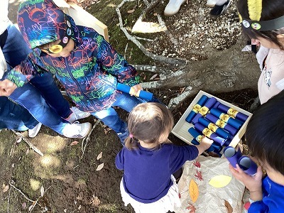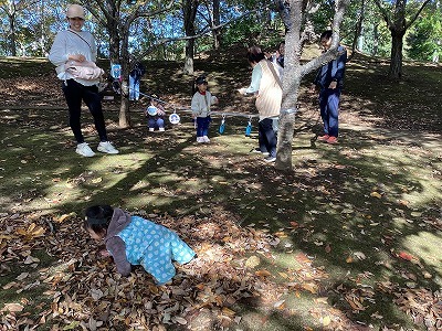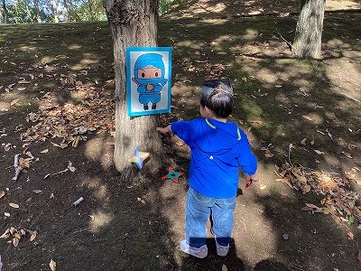 お天気に恵まれ紅葉がとてもきれいな萩原公園で、7組の親子の皆さんと「にんじゃごっこ」あそびました。隠れ身の術や変身の術、手裏剣の術など、ミッションをクリアしてお宝をゲット!葉っぱやドングリも見つけて大喜びのお子さんたちでした。