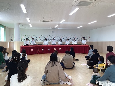 子ども達の知っている曲がたくさんあり、一緒に歌ったり体を動かしたりしながら、ハンドベルの素敵な演奏に子ども達もよく聞いていました。
