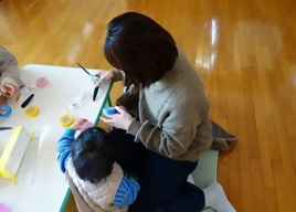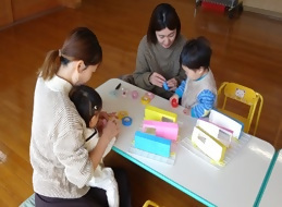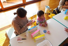ママさん達も絵本で馴染みのあるシールだった事もあり、どこに貼ろうかな~とお子さんと楽しく貼られていました。完成すると早速ボールを転がして遊んでいましたよ?3組6名の方にご参加頂きました。ありがとうございました。