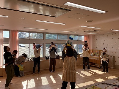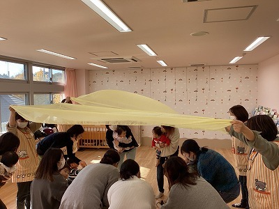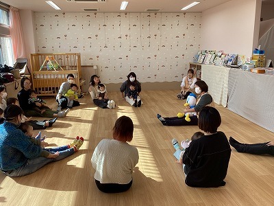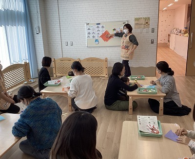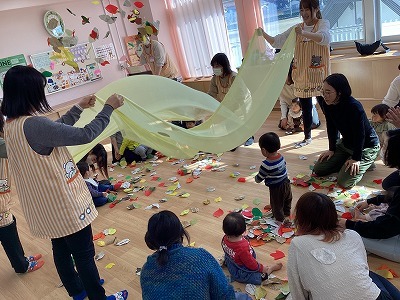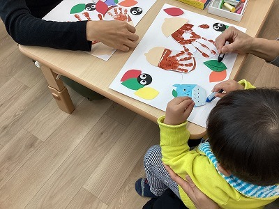 手形アートではママ達がトトロの折り紙に挑戦!久しぶりの折り紙体験を楽しんでいただきました。後半は、ピアノの音に合わせて、歌ったり抱っこで音階に合わせて動いたり、たっぷりと親子でリトミックを楽しみました。最後は秋の葉っぱに囲まれ笑顔いっぱいのお子さん達でした。