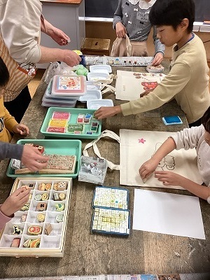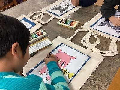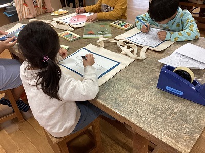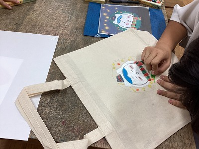 好きな絵をカーボン紙に書き写し、色を付け、好きなスタンプを押して完成!お気に入りのバッグが出来た!と喜んでくれました。14名のご参加でした。