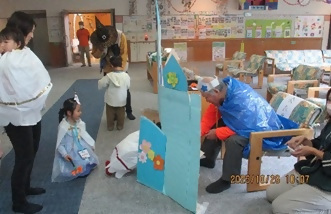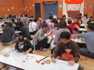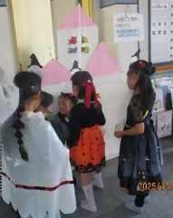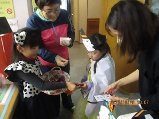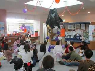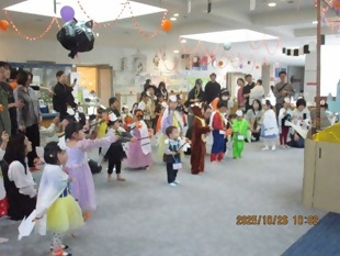 10月のハロウィンは、たくさんの親子が参加で大人も子どももびっくり。いろいろなキャラクターに変身した子どもたちでセンターは魔法の国になったようでした。ラウンジを行進して、王様や王子様やお姫様からもお菓子をもらいハロウィンのダンスも元気よく踊ることが出来ました。はじめは人数の多さに驚いていた子どもたちもいましたが、いろいろな年齢のお友だちと交流することはお互いに刺激をもらい子どもたちの成長に繋がります。子どもたちがハロウィンの主役になって元気にのびのびイベントに参加をしていたことがとても魅力的でした。たくさんのご協力ありがとうございました。次の事業も是非お待ちしています。
