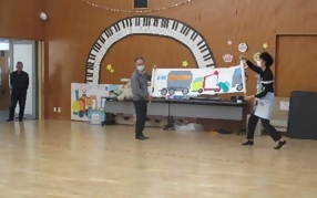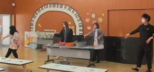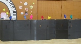 今月はみんなで七五三のお祝いをしました。最初は職員からのお祝いのプレゼント。ドレミの手袋シアターでは、親子で手拍子をして楽しんだり、キッチンオーケストラのサプライズに歓声が上がる場面もありました。千歳飴袋の製作では、のりを使ってパーツを上手に貼ることが出来ていました。最後はお名前を貼って完成です。