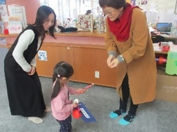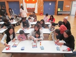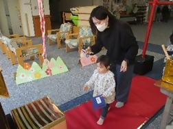 袋が完成したら、お賽銭を受け取り、ラウンジのふれあい神社に出発。本物さながらのふれあい神社に興奮しながらみんな上手にお詣りできました。最後は本物の千歳飴を袋に入れてお持ち帰り。とても楽しい時間になりました。来月のわんぱくタイムもお待ちしています。
