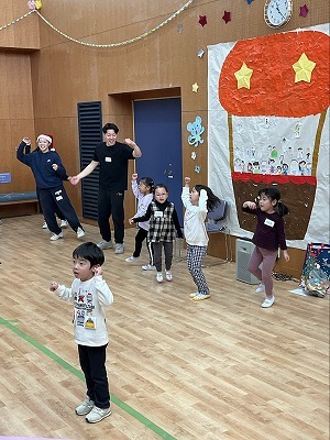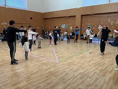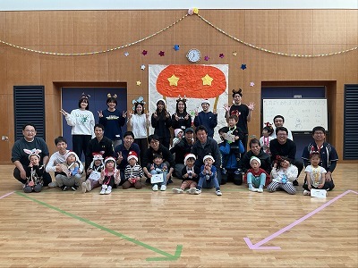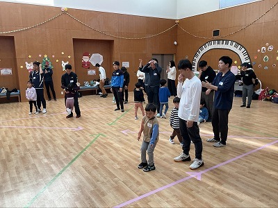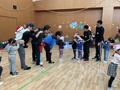 普段やらないこと、仲良く、楽しくをテーマにエビカニクスタンス、猛獣狩りゲーム、じゃんけん列車、海賊ゲーム、障害物リレー、ジャンボリミッキーダンスをパパと子どもで一緒に行いました。