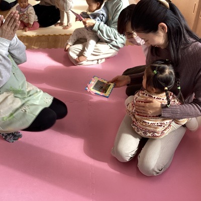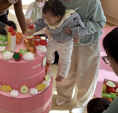 11月・12月生まれのお誕生会でした。大きなケーキに美味しそうなフルーツを飾り付けたり、バースデーソングを歌ったり、たくさんの拍手でお祝いすることができました。