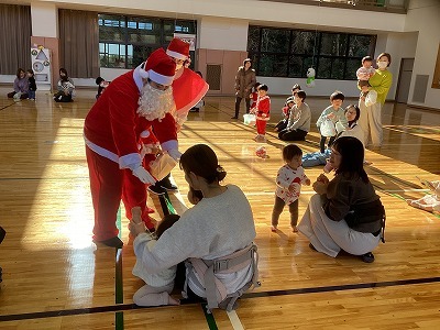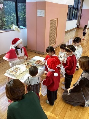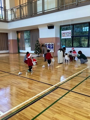 「クリスマス会」を行いました。職員からの踊りのプレゼントの後、お財布片手にクリスマスお買い物ごっこを楽しみました。最後にサンタさんが登場し、サンタさんとのハイタッチを泣くことなく行うことができ、プレゼントももらえました。