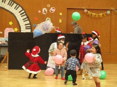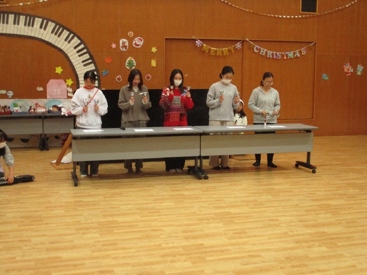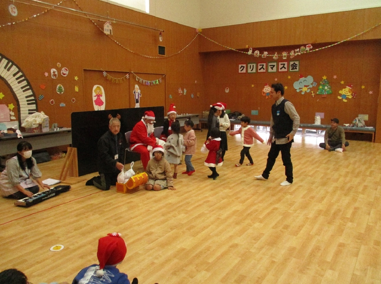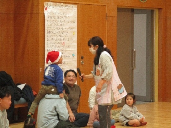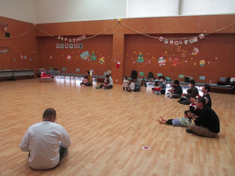今月は、ふれあいパパタイムとリフレッシュ講座の合同のイベントです。14組が参加して下さり、パパと子どもたちはレクホールで、手袋人形からスタート。小学生が人形役で参加したくるみ割り人形のお話やクリスマスのダンスを楽しみました。サンタさんも登場し、子どもたちからの質問に答え、プレゼントも届けてくれました。リフレッシュ講座で作品が完成したお母さんたちも合流し、家族みんなでフィナーレです。お母さんたちによるハンドベル演奏では練習の成果を発揮し、聴いていたみんなが感動していました。子ども担当だけではなく、地域福祉担当の職員や利用者のおじいさん、小学生等、センターに関わる方々と参加して下さったみなさんの力で、笑顔がいっぱいの時間となりました。今年も1年間、ありがとうございました。来年もみなさんと楽しいイベントを作っていきます。お待ちしています。