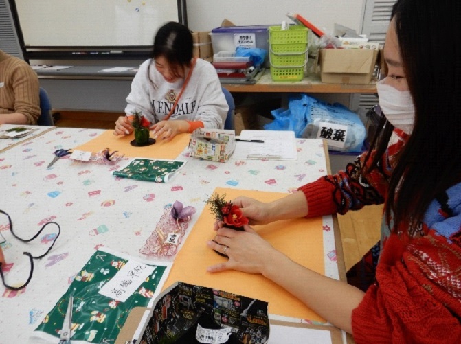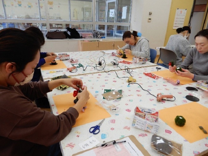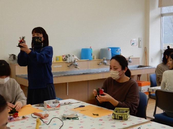 今回のリフレッシュ講座は、阿部先生をお招きして、苔玉を使ったお正月飾り作りを行いました。先生にアドバイスをいただきながら飾りのバランスをじっくりと考えながら、皆さん素敵な作品に仕上げていましたね。日々子育てに奮闘されているお母さん方からは、「ゆっくりと集中して製作出来て楽しかったです」と感想をいただきました。30分程の製作時間でしたが、お母さん方のリフレッシュとなるような時間となったのなら嬉しいです。