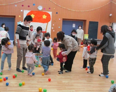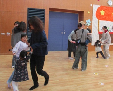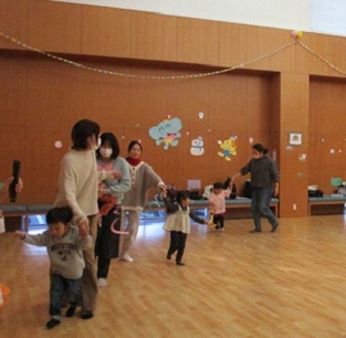 「パンダうさぎコアラ」「あなたのお名前は」で始まった1月のわんぱくタイムは「お正月遊びで昔の遊びを知ろう」です。ふれあい遊びで体をほぐしてから「とんとんとんだ~れかな?」いろんな動物がやってきて最後に今年の干支のうまさんが登場したよ。