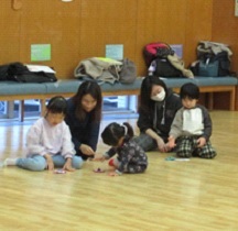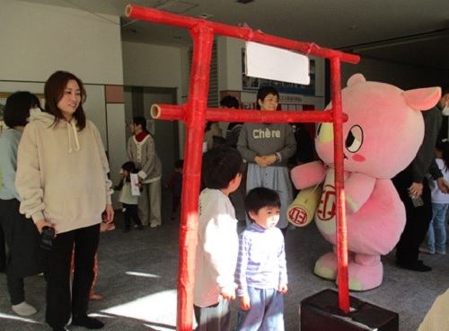 お正月遊びでは、へび凧を作って走ります。広いレクホールで元気いっぱいに走る子どもたちでした。花ごまは、先生の掛け声に合わせてくるくるくる~上手に回って良かったね。お正月遊びを楽しんでいると、いんザイ君が遊びに来てくれて、質問したり、一緒にふれあい神社で初詣したり、楽しい時間を過ごしました。