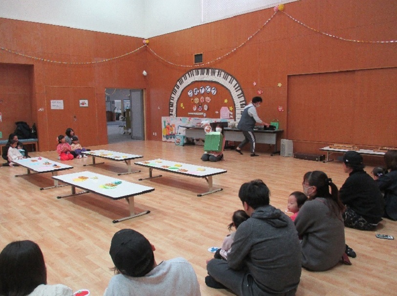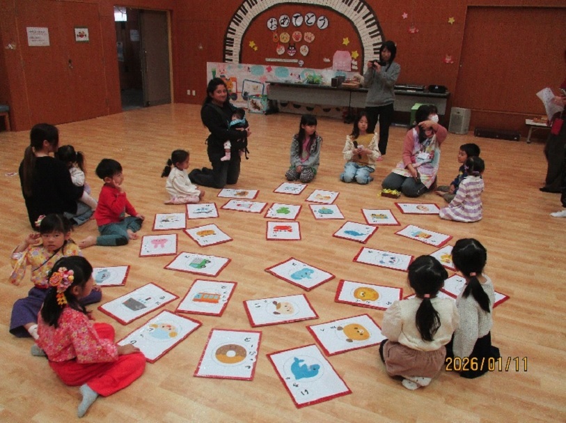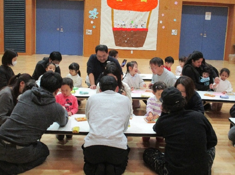 新年最初のわんぱくサンデーは、13組の親子が参加してくださり、パンダうさぎコアラの手遊びと職員による琴の演奏でスタートです。とんとんとんのお家からは、今年の干支の馬が出てきて、たこの製作やこま回し等のお正月遊びを楽しみました。作ったたこはレクホールの中を走って飛ばしました。こま回しでは、全員で回すことができ良かったです。幼稚園児が力を発揮して見本となり、小さい子どもたちも頑張っていたので、みんなの成長につながったと思います。事業の後半には、いんザイ君も遊びに来てくれて、みんなでふれあい神社にお参りに行きました。お参りで頂いた開運セットのお守りや破魔矢が、みんなのことを悪い物から守ってくれるでしょう。
