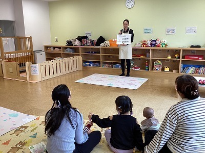 栄養士による離乳食講座を実施しました。離乳食の進め方やアレルギーなど具体的な話しに皆さん頷きながら聞いていました。